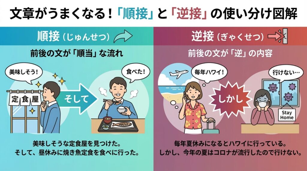 前後の出来事をつなぐ接続語には「順接」と「逆接」があります。